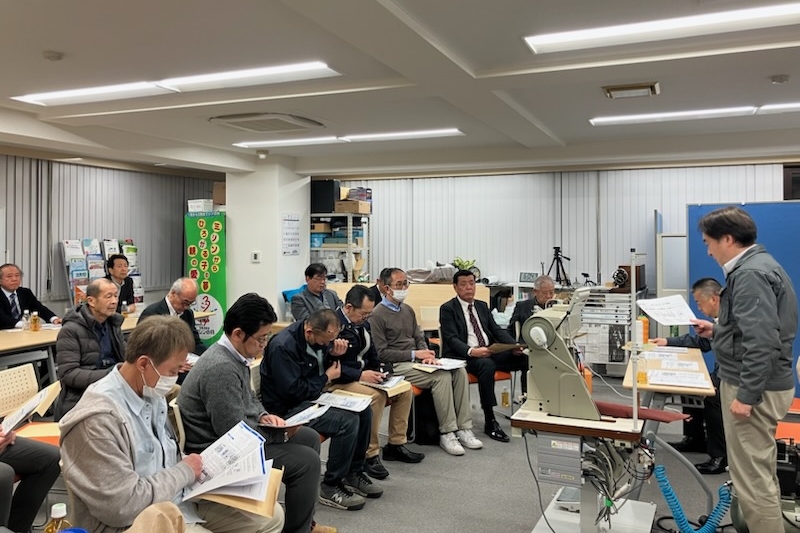 東京都ミシン商工業協同組合(立川健夫理事長)と東京都ミシン商工業協同組合技能士会(新井信久会長)は共催でセイコーミシンの主力機種の一つ「BSCシリーズ(高速度細型シリンダーベッド1本針本縫総合送り返し縫付ミシン)」の実機勉強会を2025年3月10日、組合会議室で開催した。